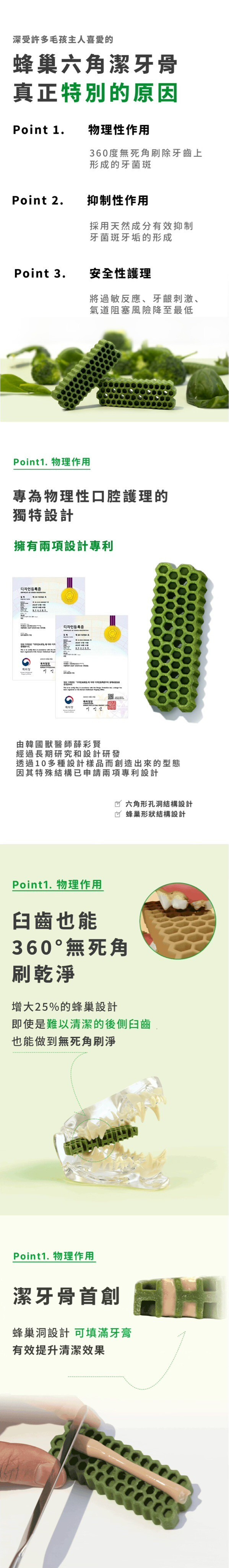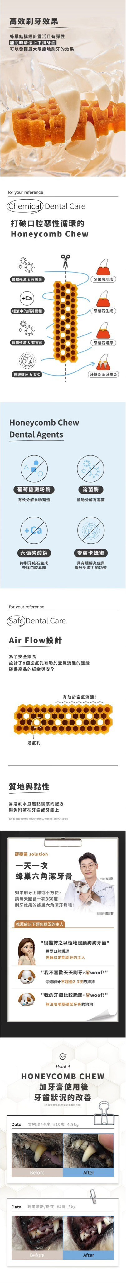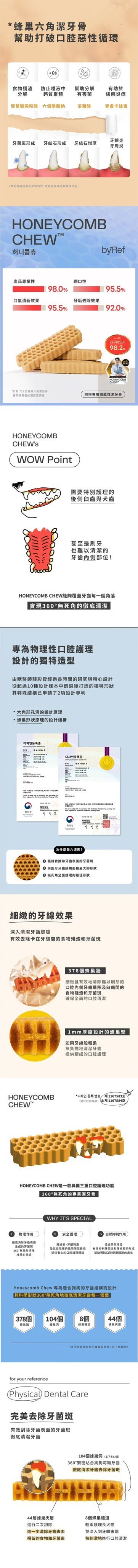 產品說明:用科學角度為狗狗依照牙齒結構來設計,蜂巢形狀能有效覆蓋所有牙齒表面,提供360度的全面護理,無縫隙去除牙菌斑,由韓國寵物行為獸醫師薛彩賢設計研發,以獨特的六角形及蜂巢形狀達成潔牙效果