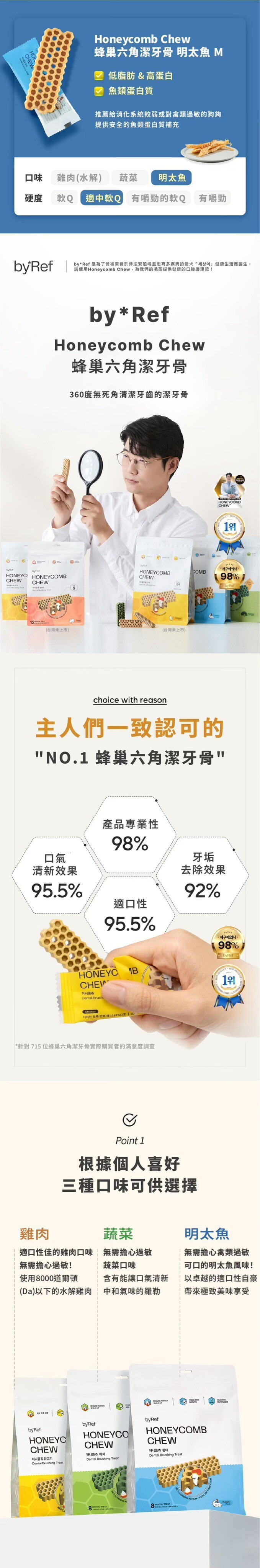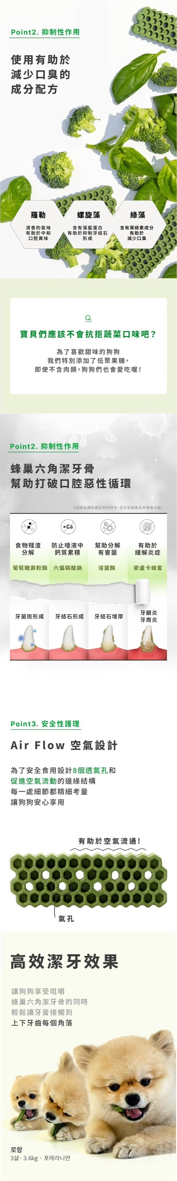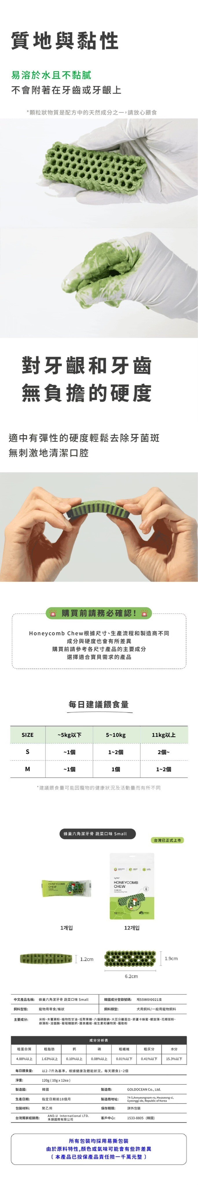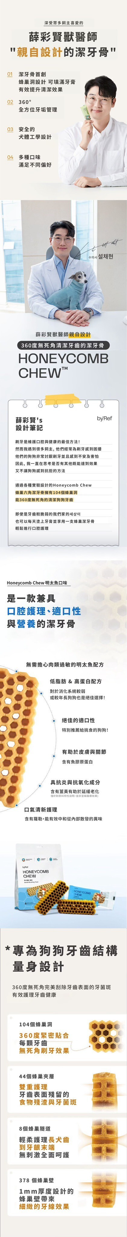 產品說明:用科學角度為狗狗依照牙齒結構來設計,蜂巢形狀能有效覆蓋所有牙齒表面,提供360度的全面護理,無縫隙去除牙菌斑,由韓國寵物行為獸醫師薛彩賢設計研發,以獨特的六角形及蜂巢形狀達成潔牙效果