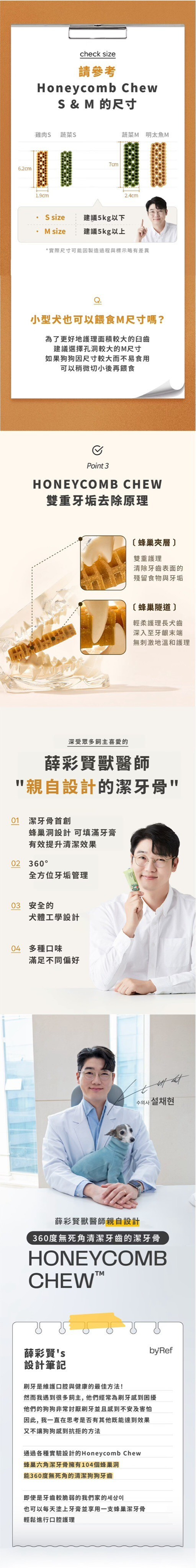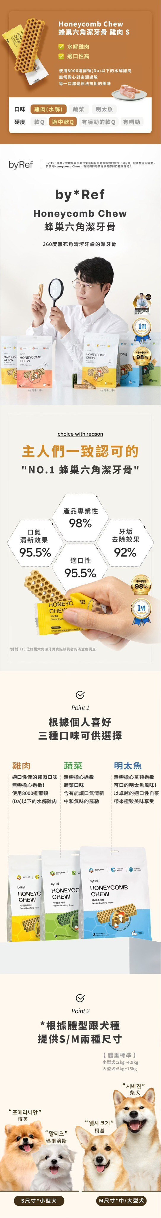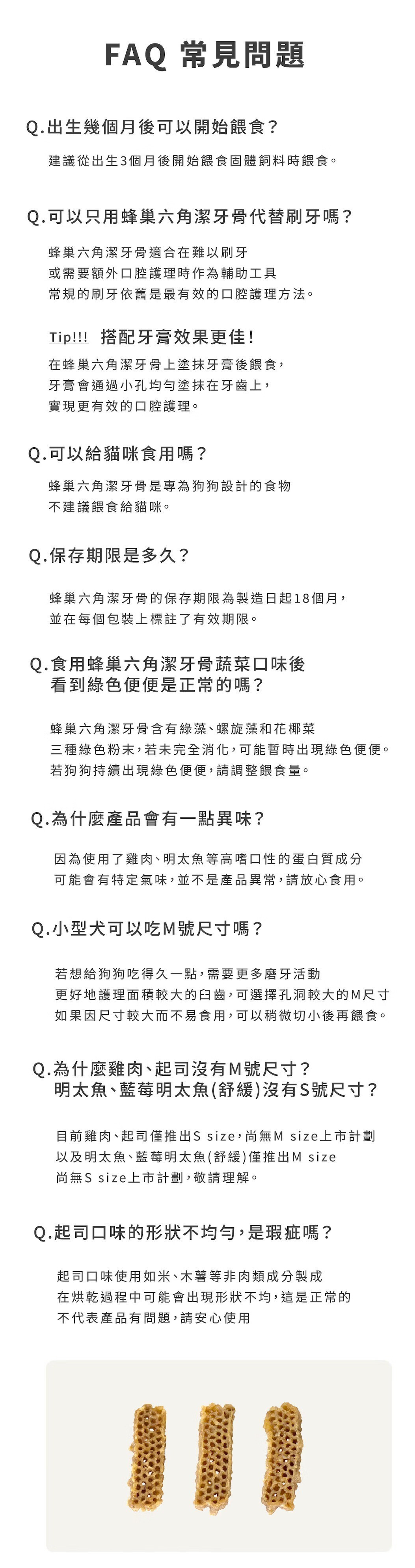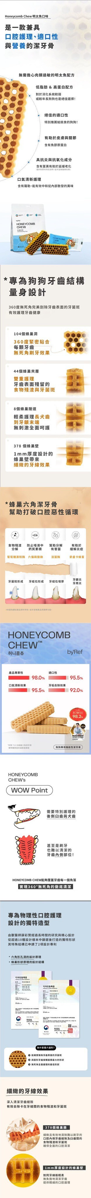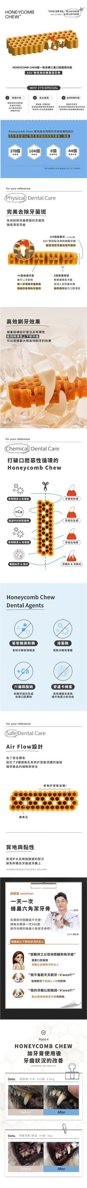 產品說明:用科學角度為狗狗依照牙齒結構來設計,蜂巢形狀能有效覆蓋所有牙齒表面,提供360度的全面護理,無縫隙去除牙菌斑,由韓國寵物行為獸醫師薛彩賢設計研發,以獨特的六角形及蜂巢形狀達成潔牙效果