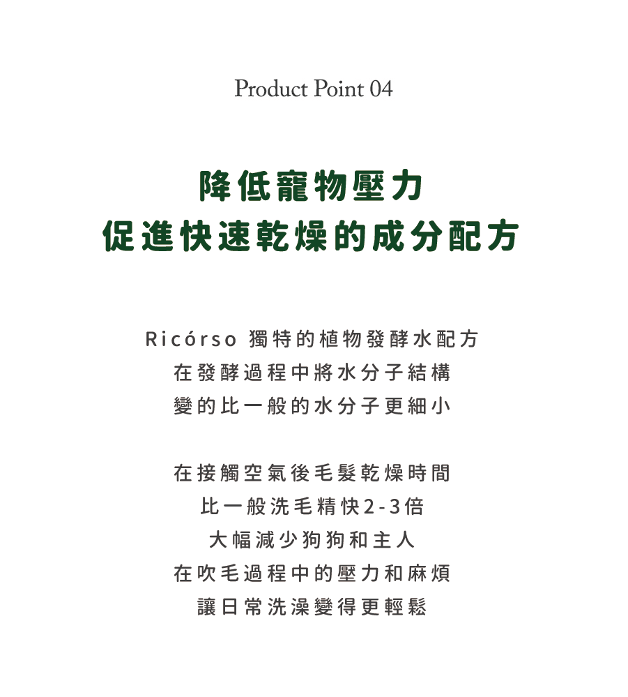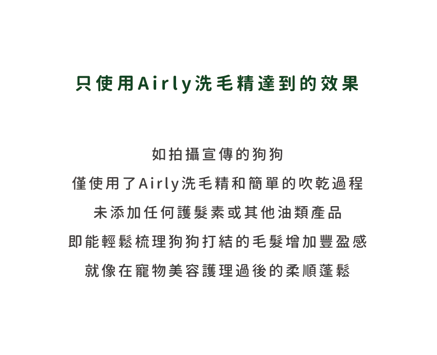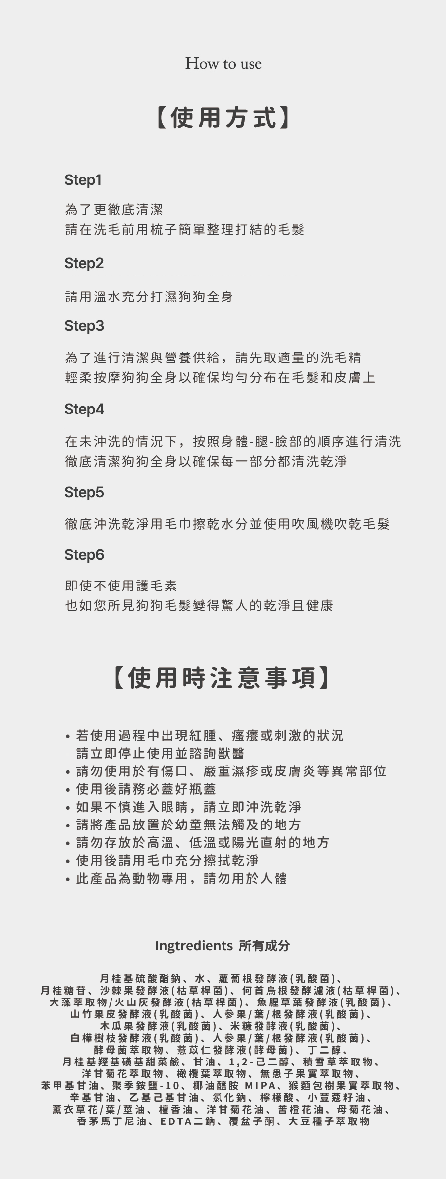 * 產品說明:天然木質調,使用後可有效潔淨肌膚,並有助解決毛髮打結問題,讓狗狗肌膚恢復活力,毛髮增添豐盈感。
