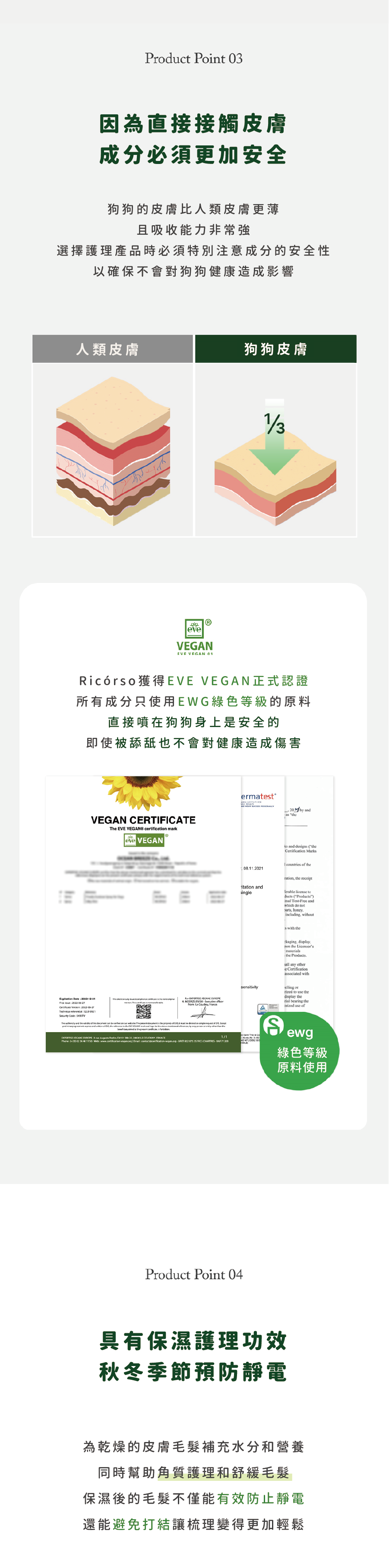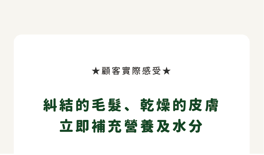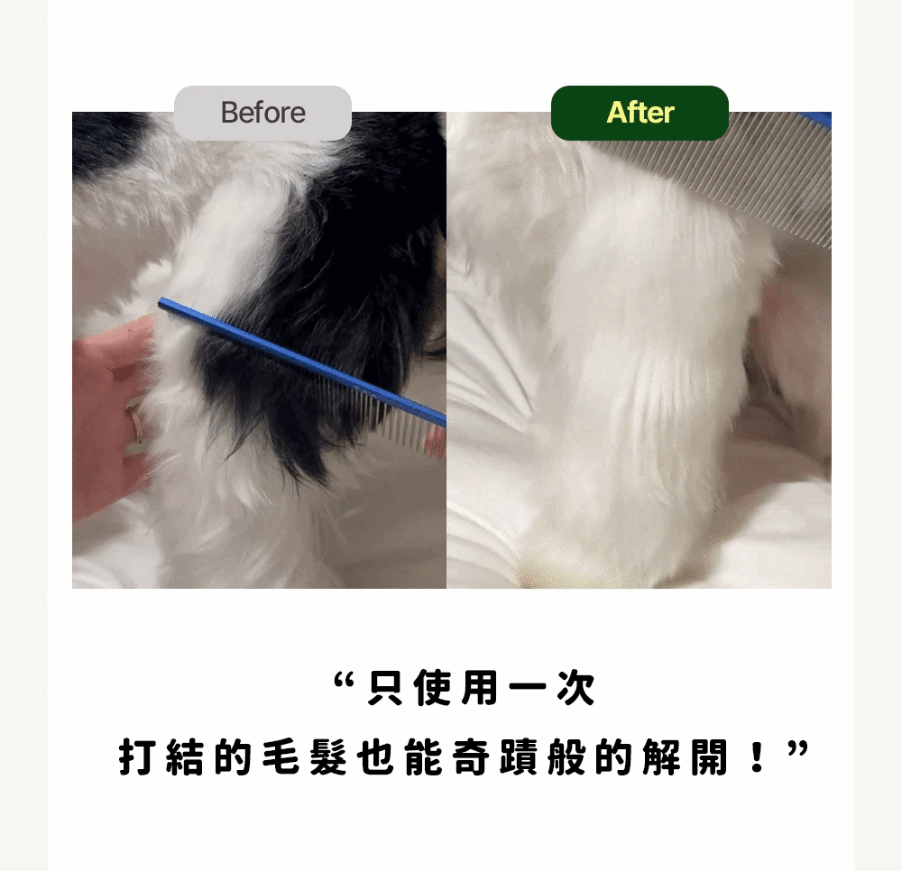 * 產品說明:滋潤寵物肌膚與保持毛髮的光澤與柔順,梳理時搭配梳子使用可有效降低拉扯,減少毛髮打結及預防靜電,並為毛髮皮膚帶來營養。
